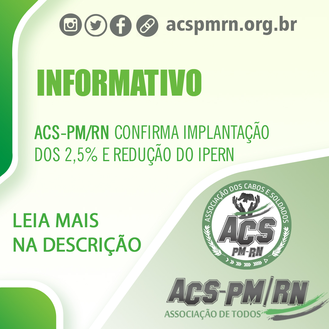 A Associação dos Cabos e Soldados da Polícia Militar do RN (ACS-PM/RN), através de sua diretoria, entrou em contato com os setores responsáveis do Estado e confirmou para o pagamento deste mês de março a implantação dos 2,5% do acordo firmado com o governo, bem como a redução da contribuição do IPERN para 9,5%, em observância a Lei Federal que versa sobre a proteção social dos militares.