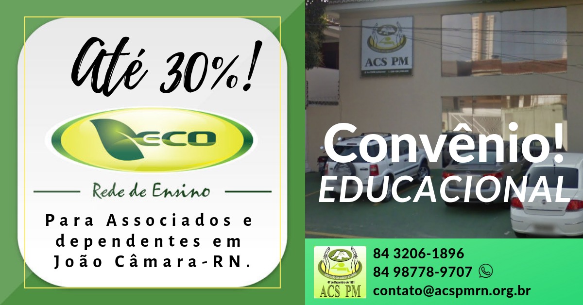 A Associação dos Cabos e Soldados da Polícia Militar do Rio Grande do Norte firma parceria com a ECO Rede Ensino, sediada em João Câmara-RN, para garantir aos associados e dependentes até 30% de descontos.