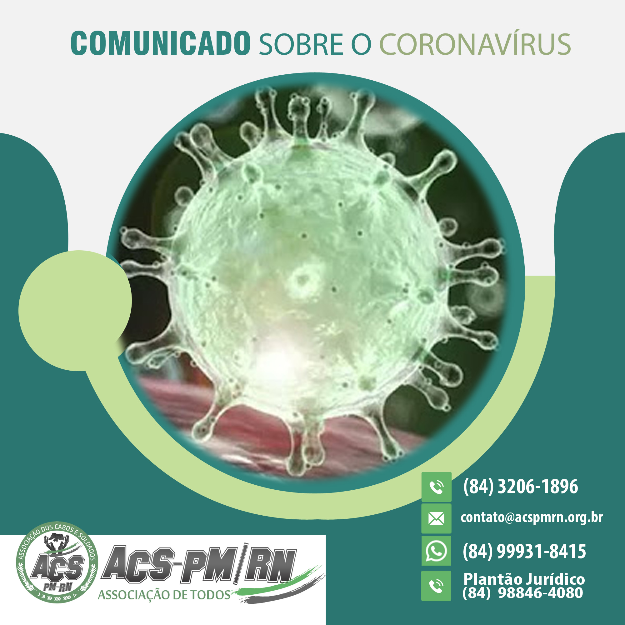 Durante este período de pandemia, a ACS-PM/RN informa que os atendimentos aos associados serão feitos prioritariamente pelo telefone da recepção (84) 3206-1896, pelo WhatsApp, através do número (84) 99931-8415, ou e-mail: contato@acspmrn.org.br