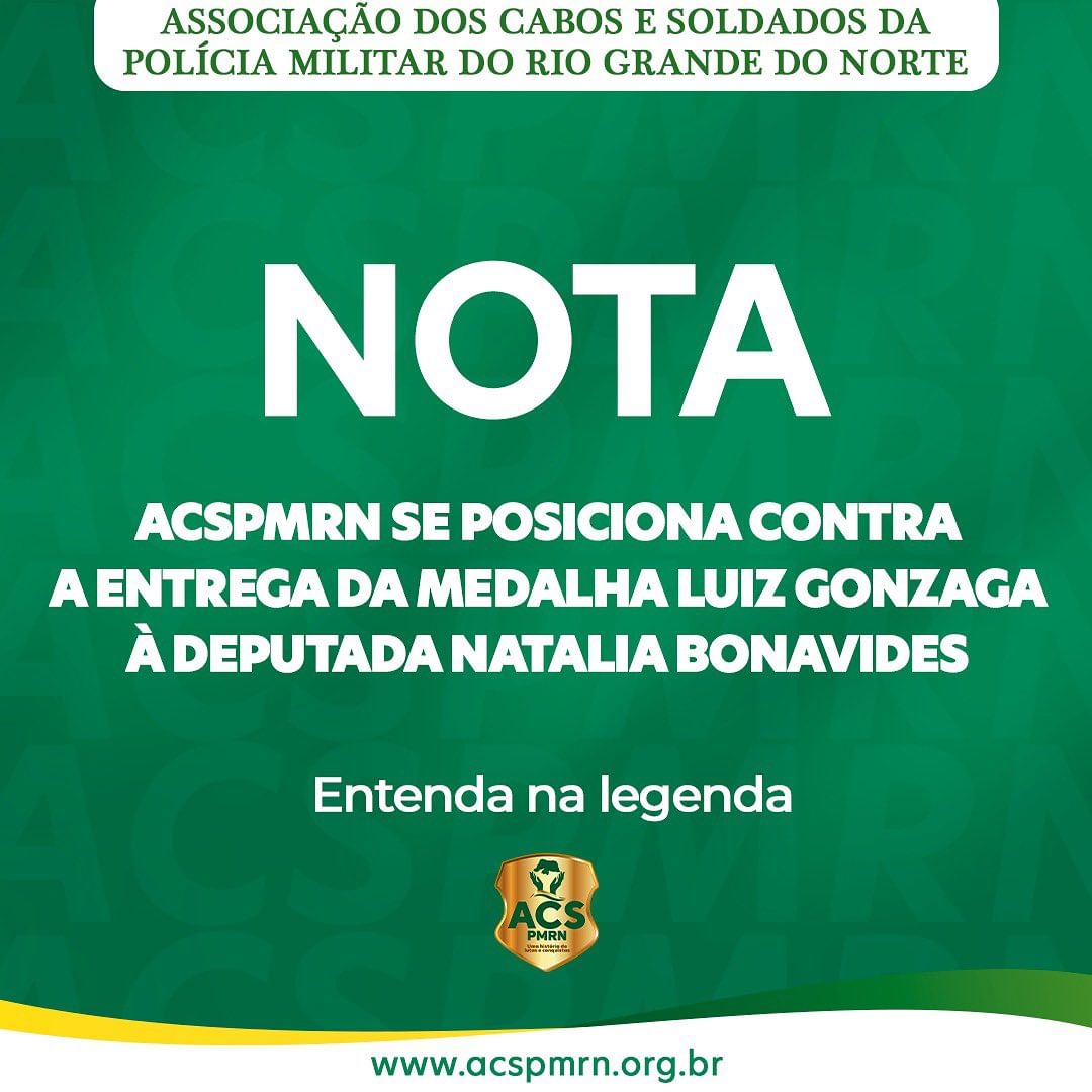 A Associação dos Cabos e Soldados da Polícia Militar do Rio Grande do Norte (ACSPMRN), entidade representativa dos praças, vem por meio desta expressar seu repúdio à entrega da medalha Luiz Gonzaga, a mais alta comenda da Polícia Militar do RN, à deputada Natália Bonavides. Entendemos que suas ações não condizem e não a dignificam para tal honraria, uma vez que ela apresenta uma postura desalinhada da defesa dos interesses e dos direitos dos operadores da segurança pública. Como exemplo, a referida parlamentar posicionou-se contra penas mais rigorosas para assassinos de policiais militares.