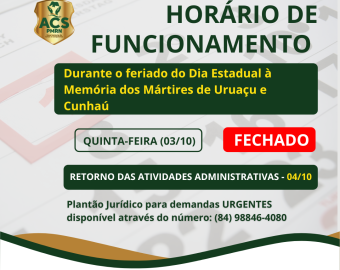 Horário de funcionamento durante o feriado do Dia Estadual à Memória dos Mártires de Uruaçu e Cunhaú.